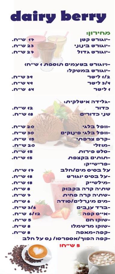- שתיה חמה- אספרסו, הפוך, שוקו חם, נס על חלב, שוקו מרשמלו, נס קפה ועוד….